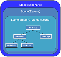 - Stage es un contenedor de alto nivel, la ventana principal de la aplicación, representa la ventana del sistema operativo. En el caso de aplicaciones embebidas en un navegador web, sería el área rectangular principal. En el caso de aplicaciones de escritorio, el stage será la ventana, con su barra de título, y botones de maximizar, minimizar o cerrar.
